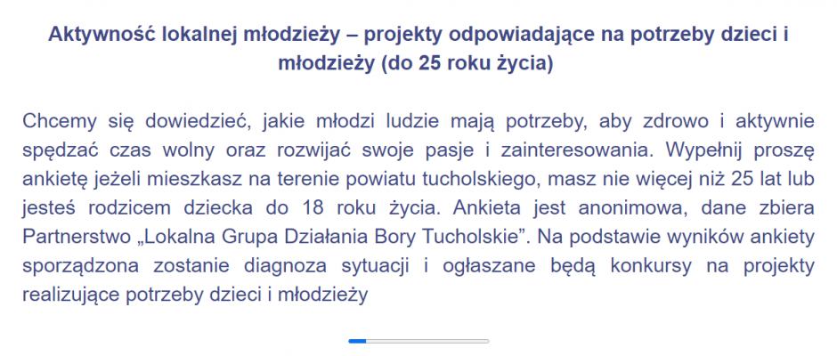 Ankieta przeprowadzana jest przez w związku z planowanym przez Partnerstwo LGD Bory Tucholskie ogłoszeniem konkursu w zakresie tematycznym „Aktywność lokalnej młodzieży – projekty zaspakajające potrzeby dzieci i młodzieży” (projekty inwestycyjne dot. budowy/wyposażenia skierowane do osób poniżej 25 roku życia).