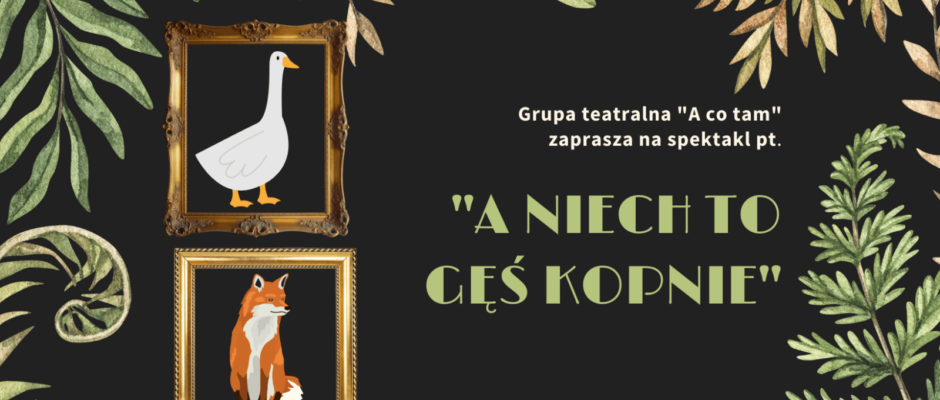 W imieniu grupy teatralnej „A co tam”, działającej pod okiem pani Beaty Ziółkowskiej, zapraszamy na spektakl pt. „A niech to gęś kopnie”.