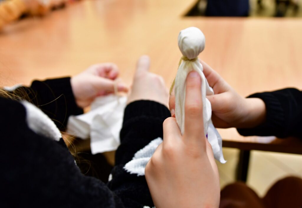 Co ciekawe, chwilę po stworzeniu główki z orzeszka i dodaniu rączek, wśród uczniów natychmiast rozpoczął się proces… ożywiania lalek! Motanki zyskiwały imiona, charaktery i relacje z innymi lalkami – wyobraźnia działała na pełnych obrotach.