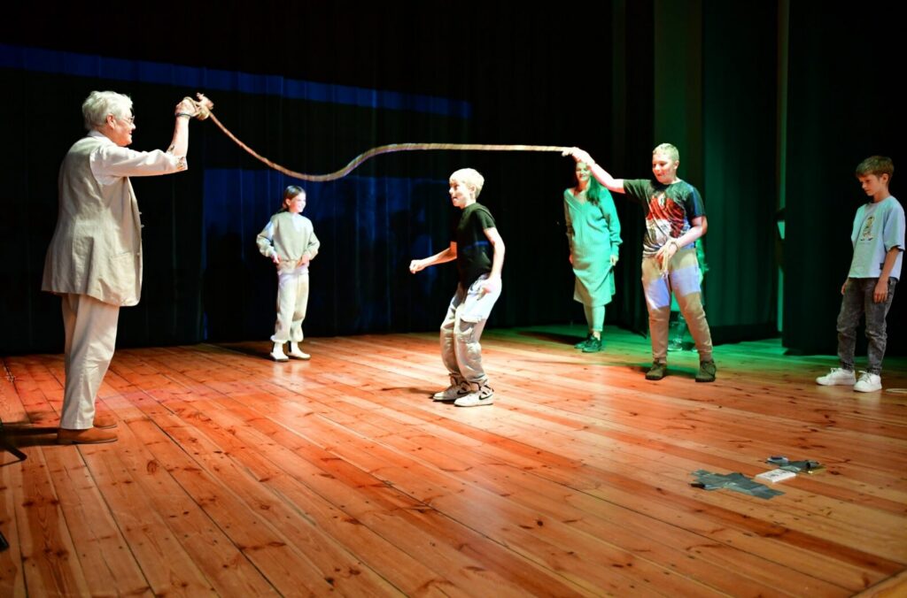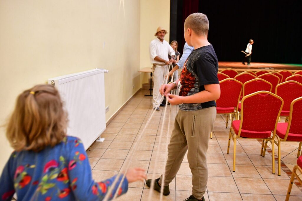 Nie zabrakło miejsca na kreatywność najmłodszych oraz podjęcie wyzwania! Dzieci wspólnie z panem powroźnikiem stworzyły linę o długości niemal całej sali widowiskowej, by później wykorzystać ją do wspólnej zabawy i integracji – skakania przez linę!