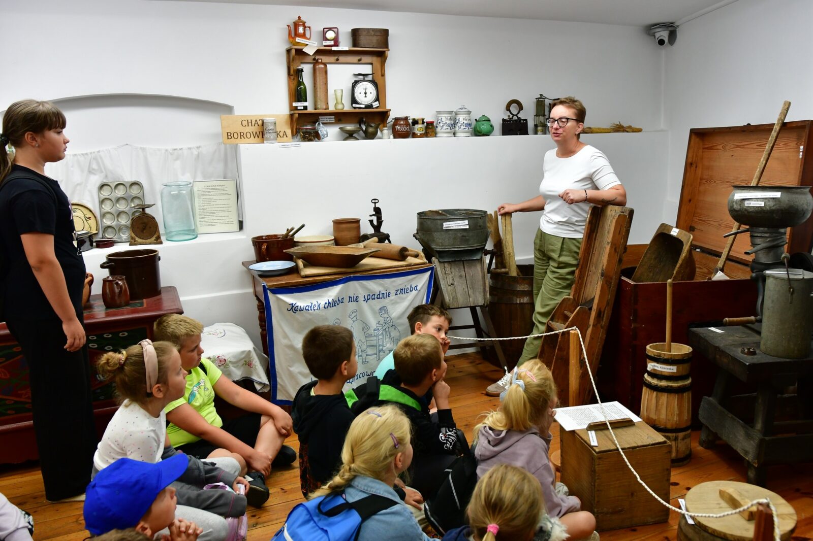 - przedmioty codziennego użytku, wystrój chaty i tradycyjne stroje wraz z ich borowiackimi nazwami.