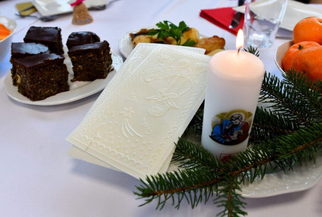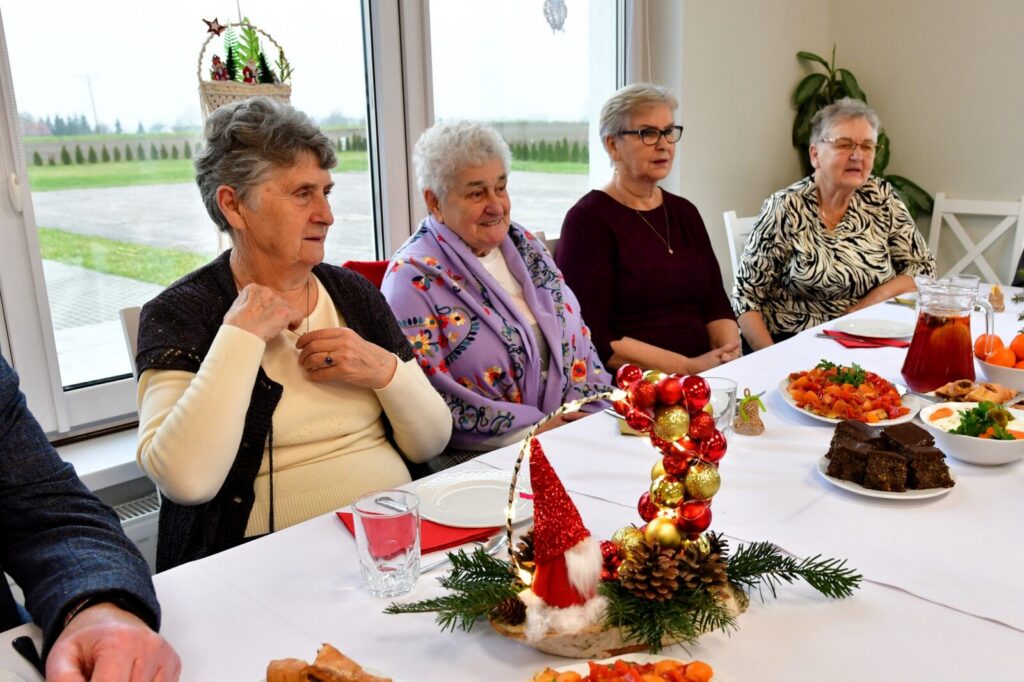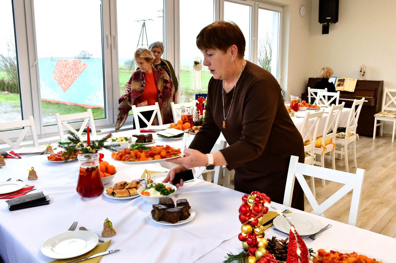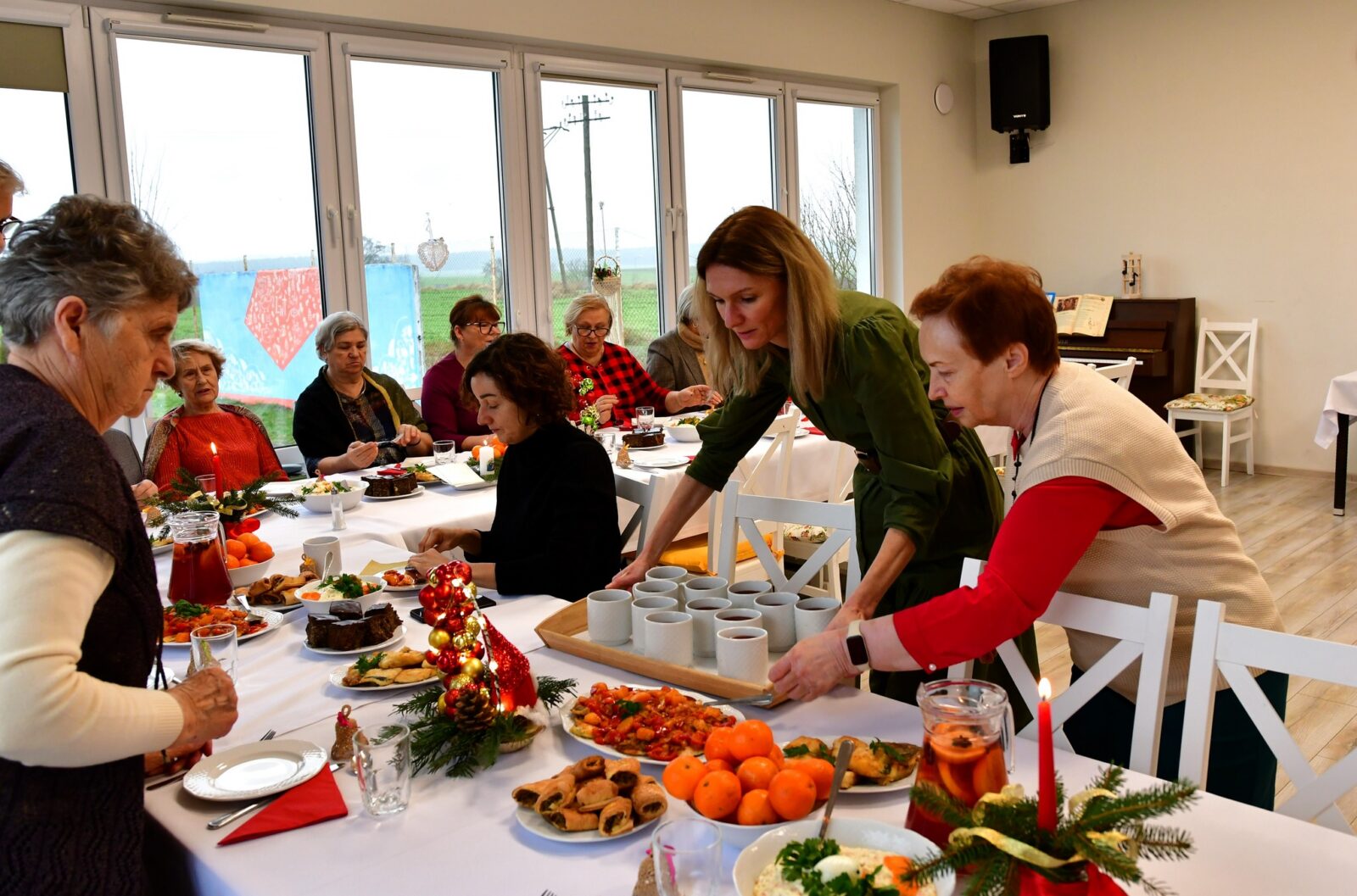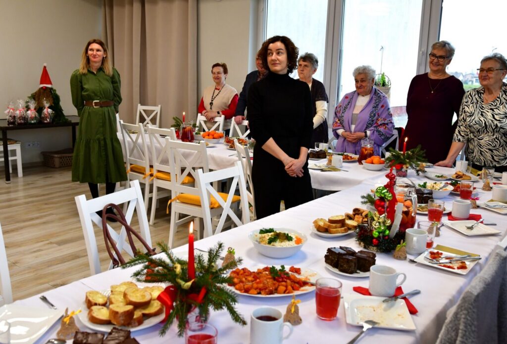 Jedna grupa zadbała o piękny, świąteczny wystrój stołów oraz sali, pozostałe osoby przejęły przygotowanie pysznych dań. W naszej grupie seniorek mamy ogrom kulinarnych talentów, dzięki którym na naszych stołach zagościł aromatyczny barszcz z pasztecikami, warzywna sałatka, ryby oraz słodki poczęstunek – a serca wszystkich skradł makowiec po japońsku.