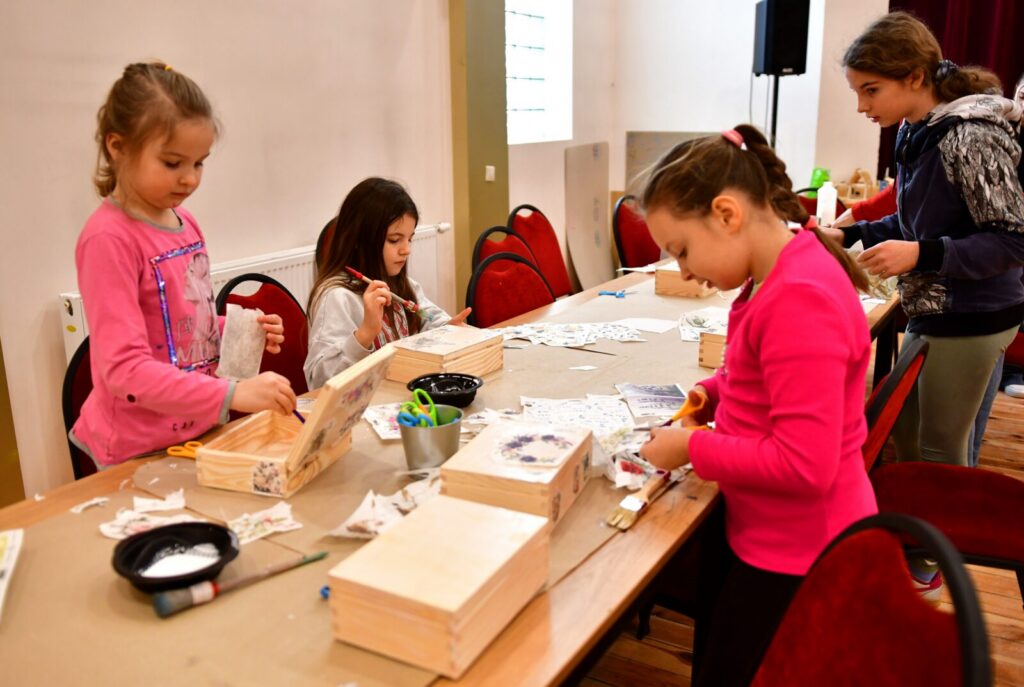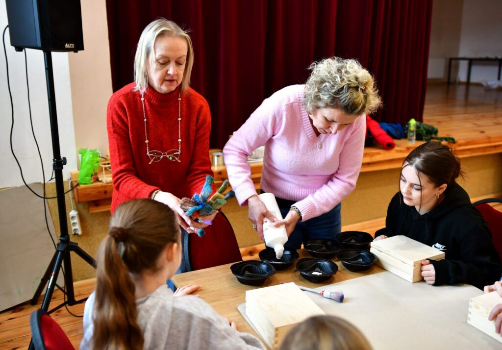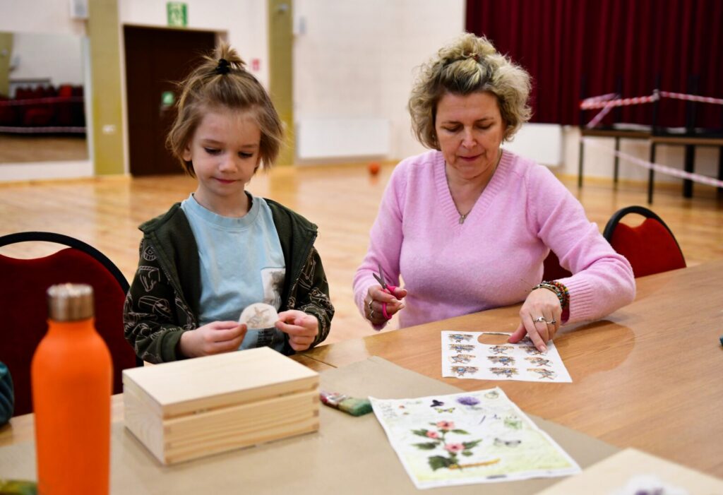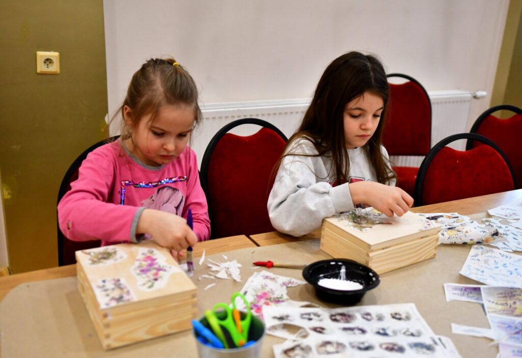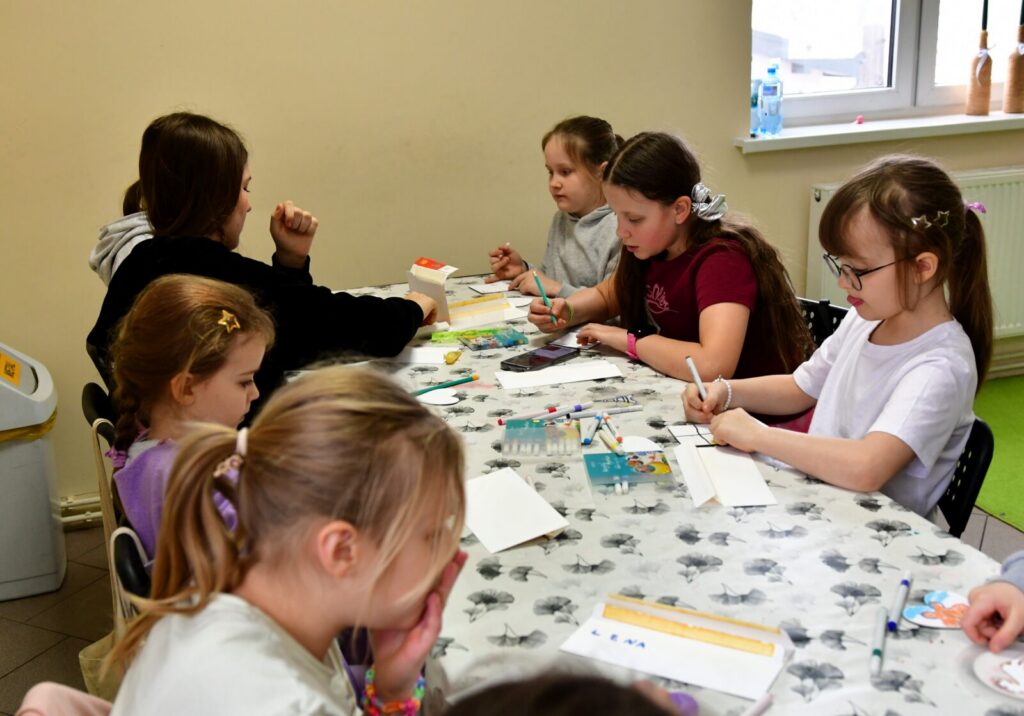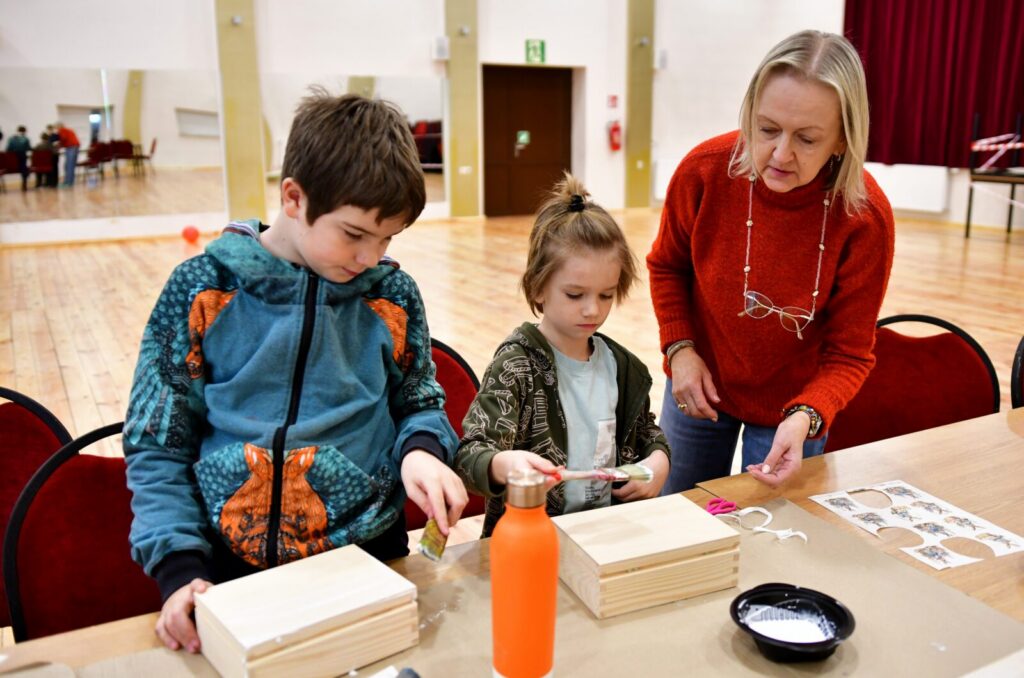 Tutaj nie brakowało ruchu i dobrej zabawy! Dużą dawkę energii przyniosła gra w „prawdę czy wyzwanie”, która nie tylko rozruszała uczestników i uczestniczki, ale też świetnie zintegrowała grupę. W części twórczej dzieci ozdabiały drewniane skrzynki papierem ryżowym – powstały wyjątkowe miejsca do przechowywania małych (i dużych!) skarbów. Zajęcia w Bysławiu prowadzą niezawodne panie Bogusia i Halinka.