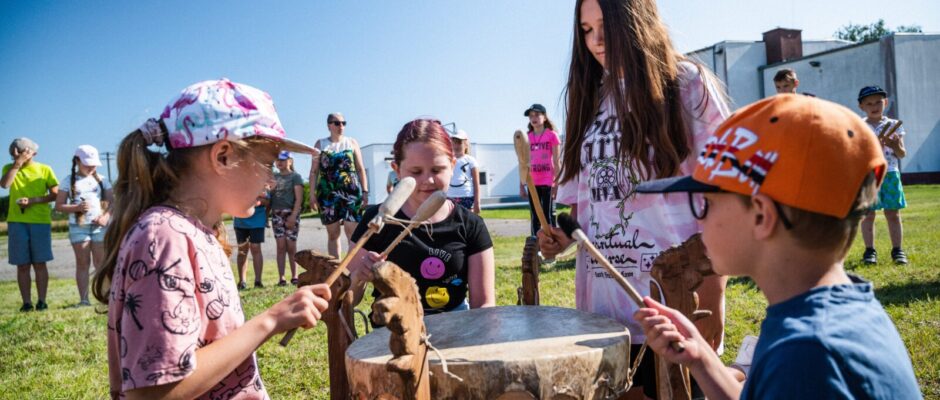 Podczas wakacji podejmowaliśmy temat wolności, odwołując się do świata Indian. Uczestnicy w pierwszej kolejności poznawali codzienne życie Indian Ameryki Północnej (elementy stroju, wyposażenie tipi, zabawki czy instrumenty) oraz rytuały. Następnie przeszli do głębszego etapu poznania indiańskiej kultury: życia w równowadze i harmonii ze światem, szacunku dla natury, budowania wspólnoty, komunikacji opartej na partnerstwie i szacunku. Staliśmy się plemieniem Dzikich Bizonów. Każdy z nas wybrał sobie nowe, indiańskie imię. Pracowaliśmy w trzech kręgach warsztatowych: tańca, znaków i gestów oraz rękodzieła. Moc kręgu poznawaliśmy również w czasie wspólnych momentów: powitania dnia czy rytuału snucia indiańskich opowieści. Za pośrednictwem działań artystycznych stworzyliśmy historię naszego plemienia i zaprezentowaliśmy ją w czasie finałowego widowiska, włączając widzów do naszej wspólnoty. Najważniejsza dla uczestników okazała się pieśń mocy. Jest to ich autorska pieśń i jak sami to wypowiedzieli „jest ona dla nas najważniejsza”.