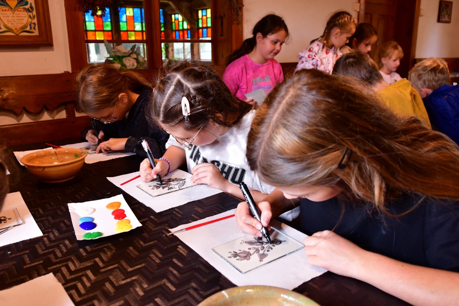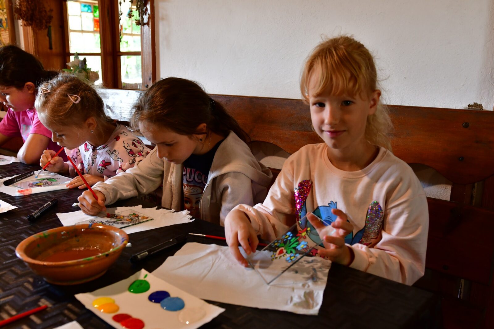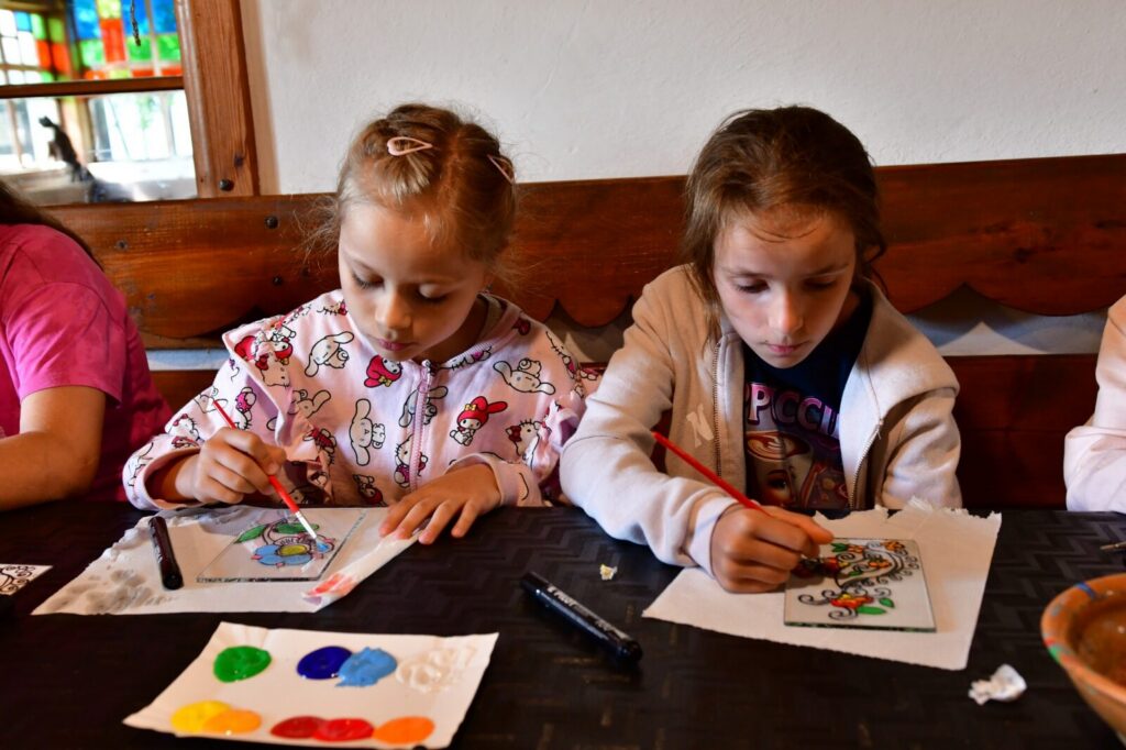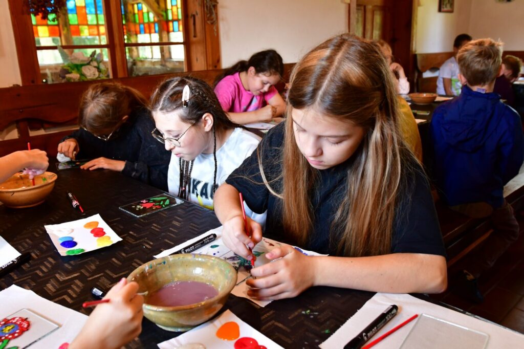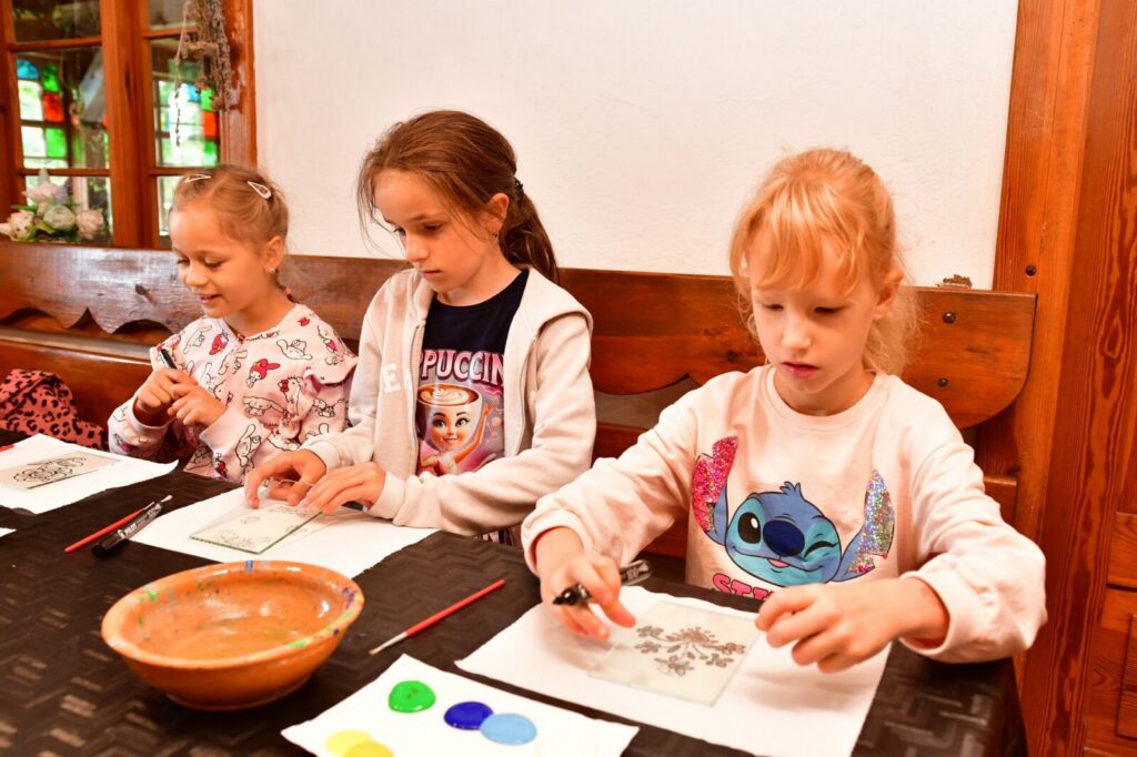 Największą frajdę sprawiły nam warsztaty malowania na szkle, inspirowane tradycyjnym haftem i kolorystyką kaszubską. Powstały przepiękne, barwne dzieła, w których widać mnóstwo serca i dziecięcej wyobraźni!
