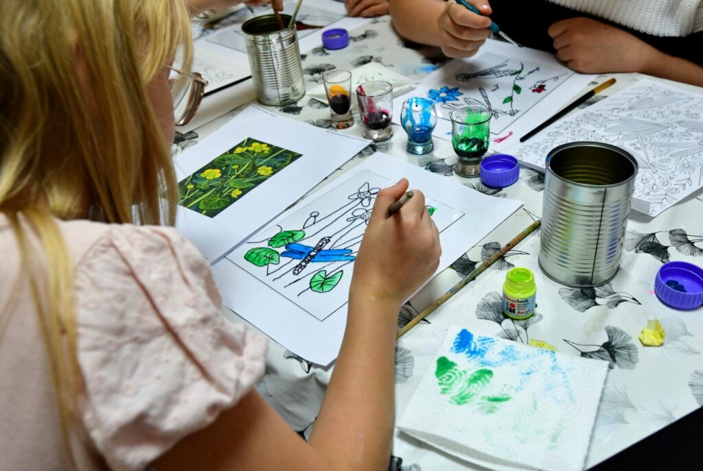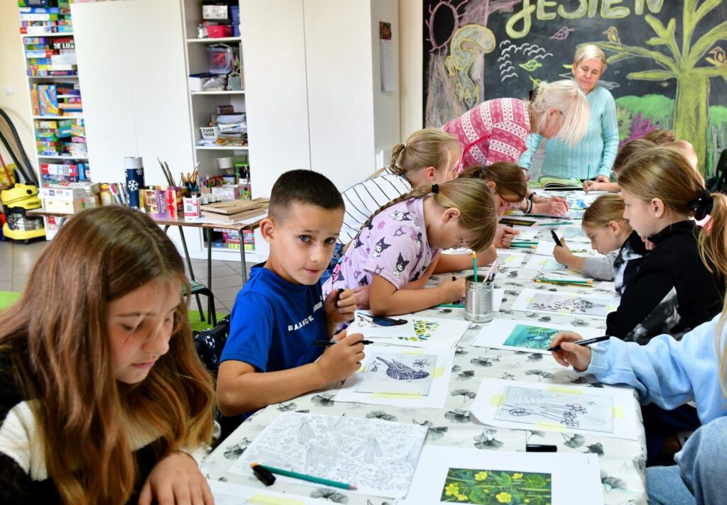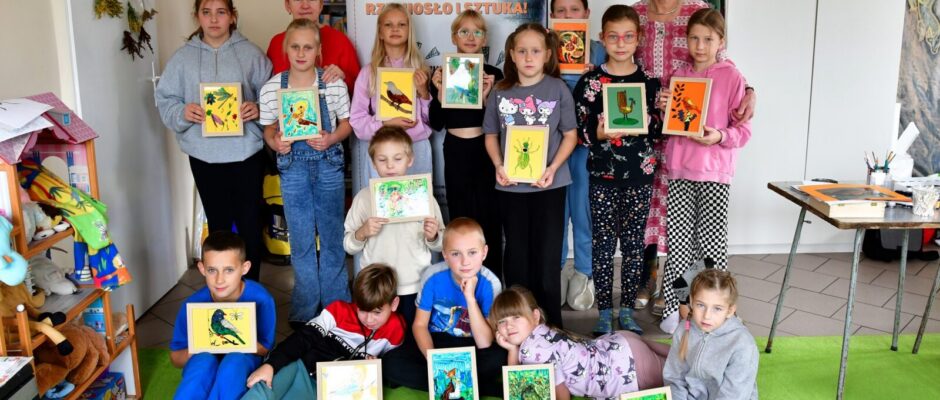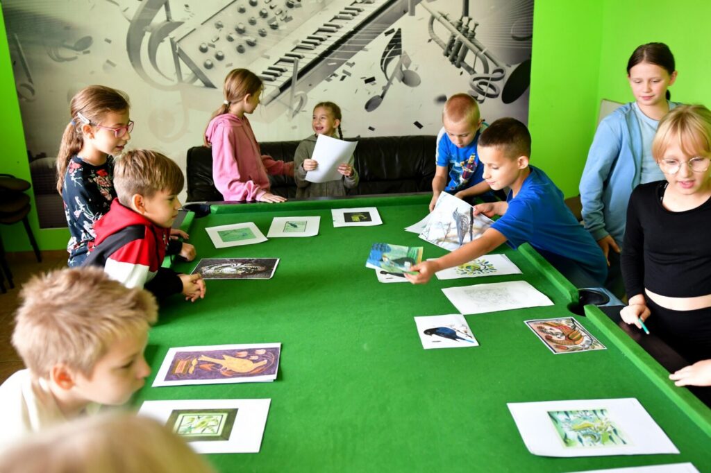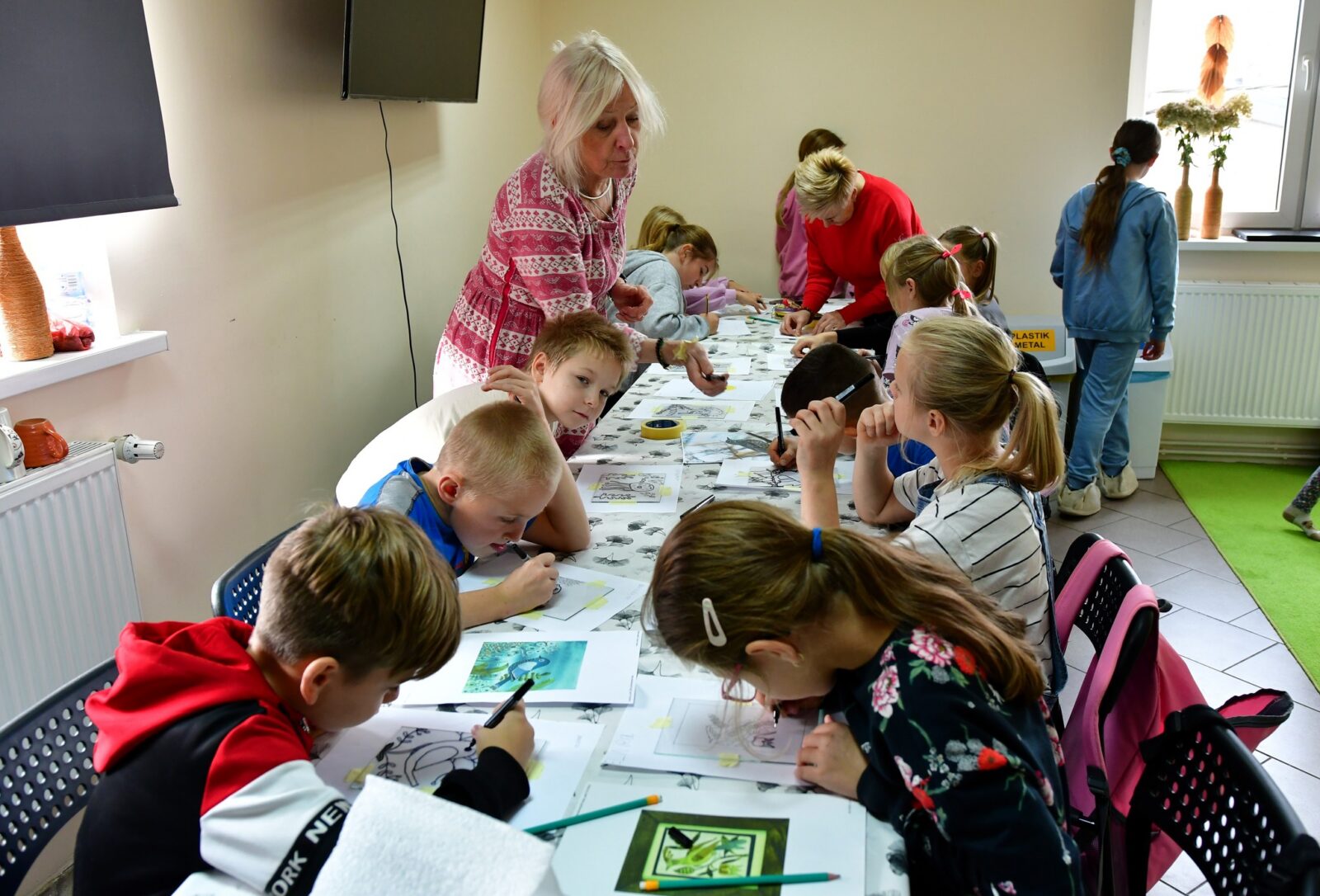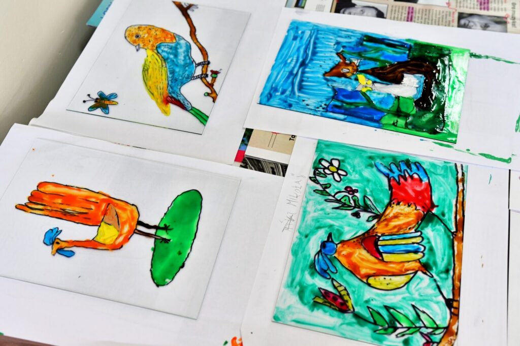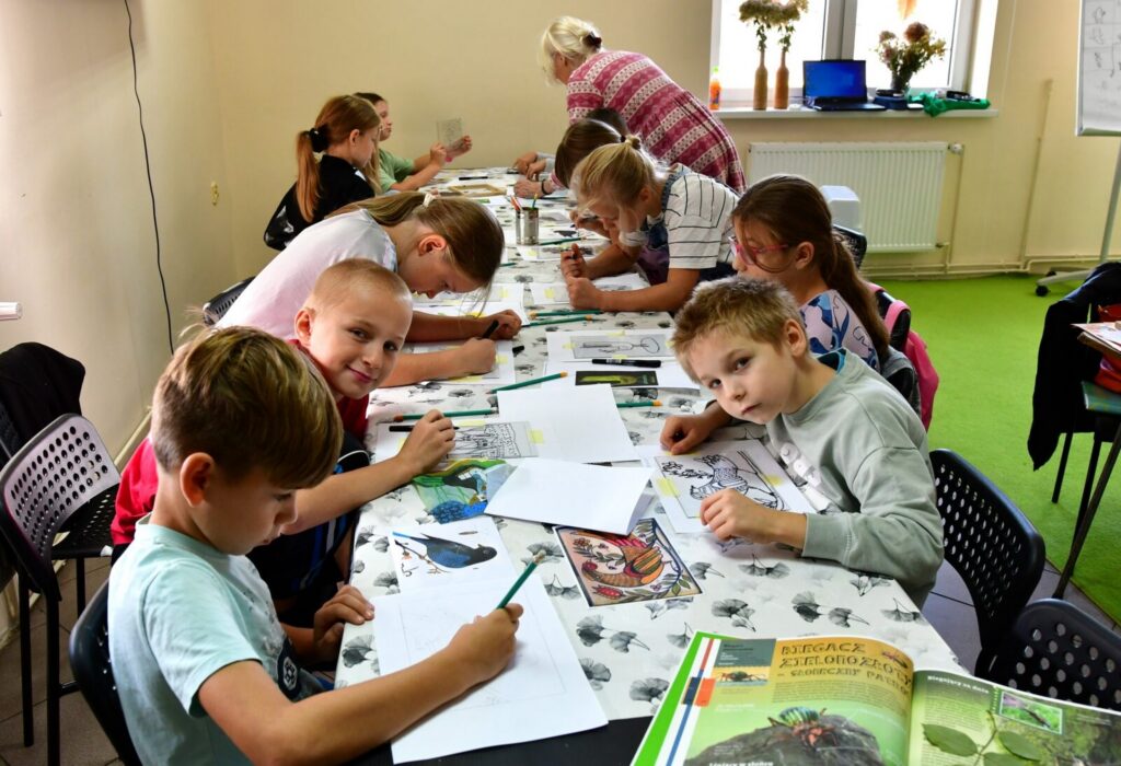 Drugiego dnia uczestniczki i uczestnicy zajęć pod okiem pani Alicji Wiślińskiej-Kornackiej mogli cieszyć się pełnym efektem swojej pracy – barwne ilustracje zyskały tła i ramy, a młodzi artyści odważnie sygnowali je własnymi podpisami.