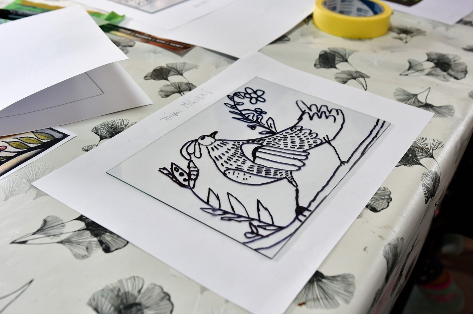 Na początku uczestnicy poznali tajniki tej wyjątkowej techniki, wywodzącej się z bogatej tradycji sztuki ludowej Borowiaków. Malowanie na szkle, niegdyś popularne w domach borowiackich, łączy w sobie prostotę wykonania z niezwykłym efektem barwnej głębi i świetlistości.