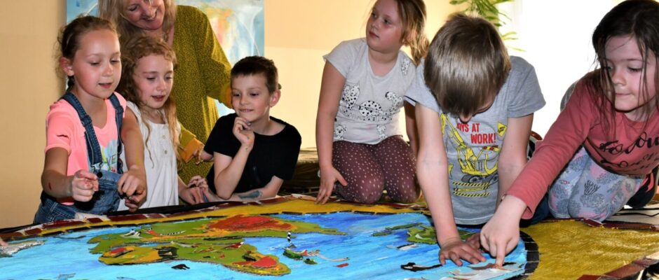 Póki co podróżujemy palcem po mapie! Ale za to jakiej! W ramach realizacji projektu „Poznawanie przez podróżowanie” dofinansowanego ze środków Ministerstwa Kultury, Dziedzictwa Narodowego i Sportu Alicja Wiślińska – Kornacka z Torunia poprowadziła warsztaty manualne, na których stworzyliśmy ogromną mapę!