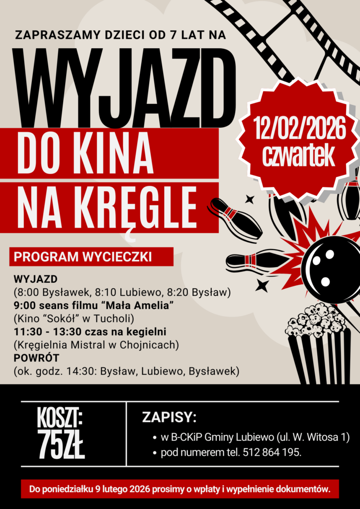 Wyjazd: 8:00 – Bysławek, 8:10 – Lubiewo, 8:20 – Bysław