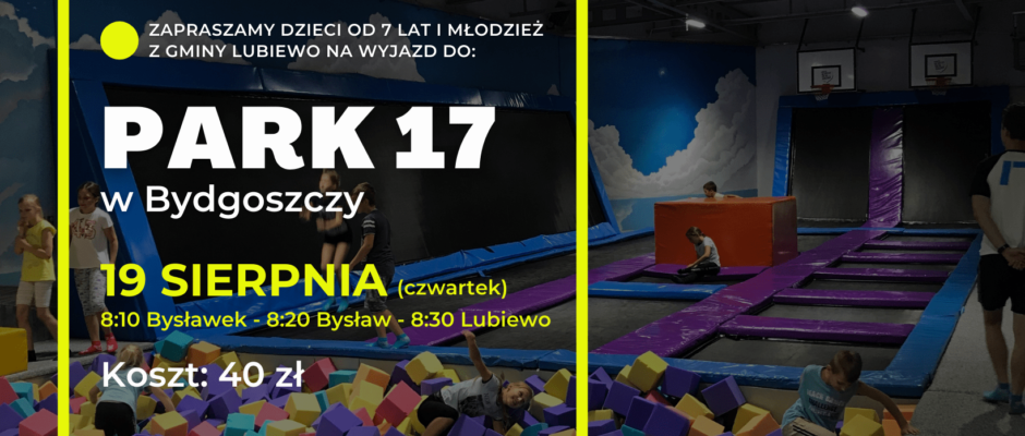 Zapraszamy dzieci od 7 lat i młodzież z gminy Lubiewo na wyjazd do Park17 Centrum zabaw i trampolin w Bydgoszczy!