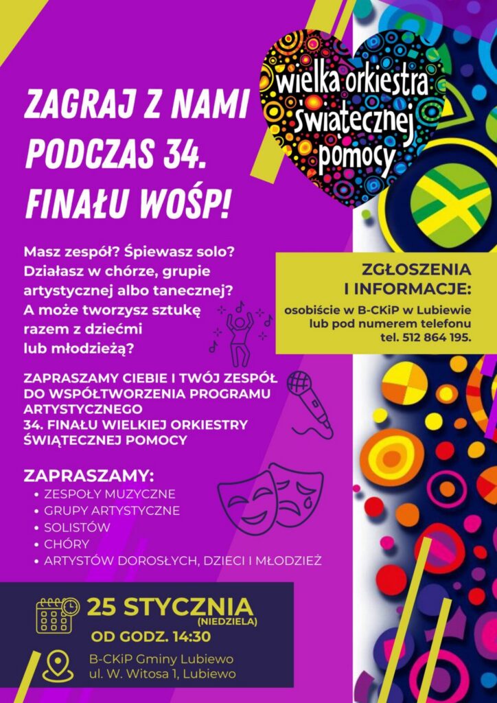 34. Finału Wielkiej Orkiestry Świątecznej Pomocy B-CKiP w Lubiewie.